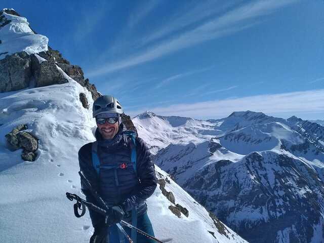 Au sommet, on hésite à basculer dans le couloir. Avec ce froid, la neige revient difficilement, même en Est. Finalement, on se lance en choisissant les contre-pentes Sud. Bonne option ! C'est raide mais la neige est agréable à skier.